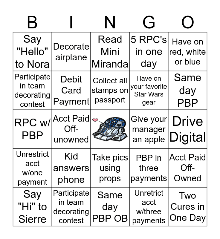 This bingo card has a free space and 24 words: Kid answers phone, Participate in team decorating contest, Collect all stamps on passport, Say "Hi" to Sierre, Have on red, white or blue, Say "Hello" to Nora, Participate in team decorating contest, Decorate airplane, Give your manager an apple, Take pics using props, Have on your favorite Star Wars gear, RPC w/ PBP, PBP in three payments, Acct Paid Off-Owned, Debit Card Payment, Unretrict acct w/three payments, Drive Digital, Read Mini Miranda, Same day PBP, Acct Paid Off-unowned, Two Cures in One Day, Unrestrict acct w/one payment, 5 RPC's in one day and Same day PBP OB.
