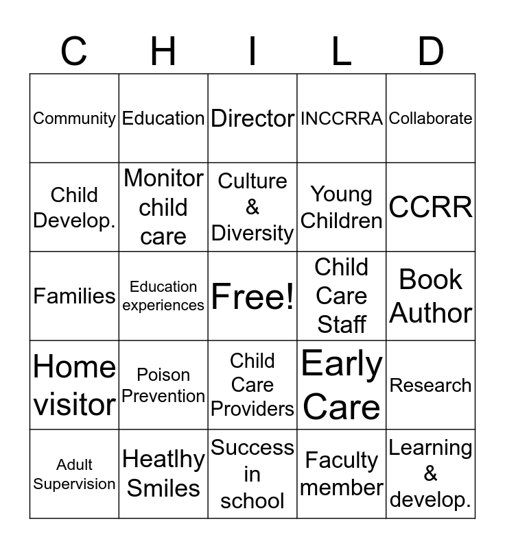 This bingo card has a free space and 24 words: Poison Prevention, Heatlhy Smiles, Culture & Diversity, Adult Supervision, Collaborate, Community, Child Develop., Education, Child Care Staff, Child Care Providers, Young Children, Families, Early Care, Research, Monitor child care, Faculty member, Book Author, Director, CCRR, Education experiences, Learning & develop., Home visitor, INCCRRA and Success in school.