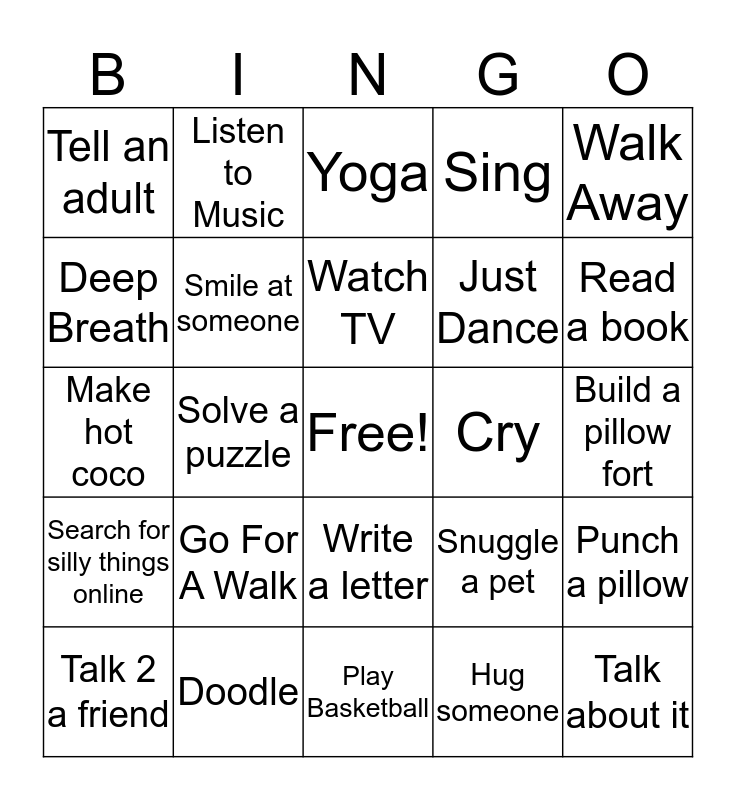 This bingo card has a free space and 24 words: Go For A Walk, Doodle, Watch TV, Talk 2 a friend, Walk Away, Tell an adult, Deep Breath, Listen to Music, Cry, Write a letter, Just Dance, Make hot coco, Snuggle a pet, Punch a pillow, Smile at someone, Hug someone, Build a pillow fort, Yoga, Read a book, Solve a puzzle, Talk about it, Search for silly things online, Sing and Play Basketball.