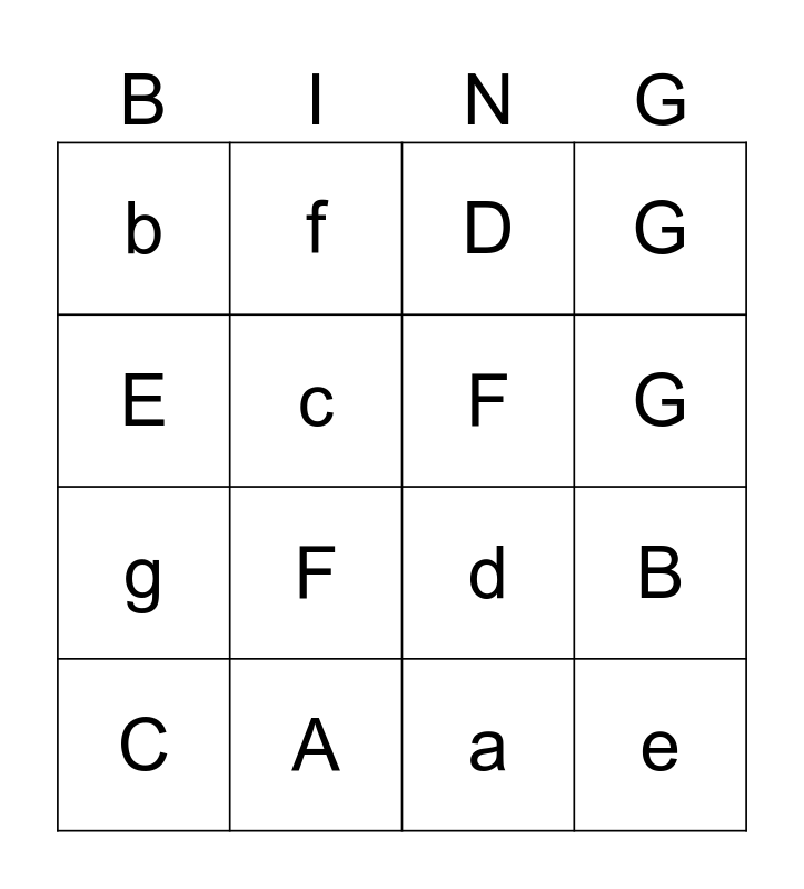 This bingo card has 16 words: A, B, D, b, g, f, d, a, E, c, C, G, F, G, F and e.