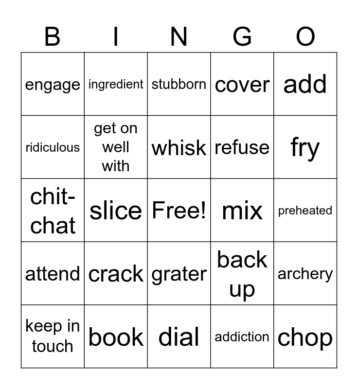 This bingo card has a free space and 44 words: accept, chop, count on, keep in touch, confirm, addiction, stubborn, cut, add, book, cover, mix, grater, crack, bill, dial, cuisine, chit- chat, dough, fry, ingredient, mash, pan, engage, peel, preheated, camping, bad line, back up, attend, saucepan, archery, come over, available, slice, bad tempared, hold on, buddy, whisk, ridiculous, refuse, hang up, get on well with and deadline.