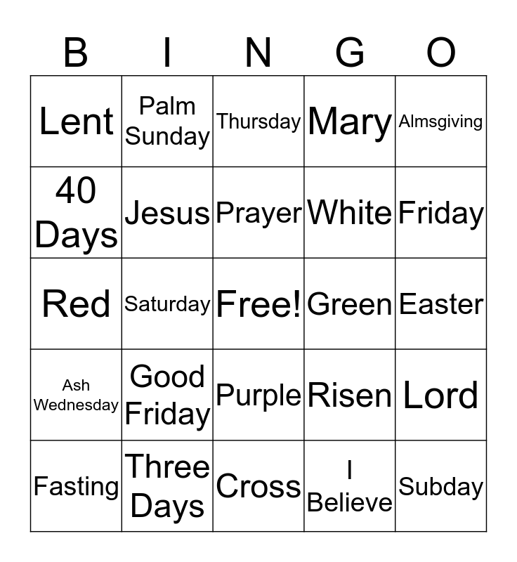 This bingo card has a free space and 24 words: Good Friday, Three Days, Prayer, Fasting, Almsgiving, Lent, 40 Days, Palm Sunday, Green, Purple, White, Red, Risen, Lord, Jesus, I Believe, Easter, Thursday, Friday, Saturday, Subday, Ash Wednesday, Mary and Cross.