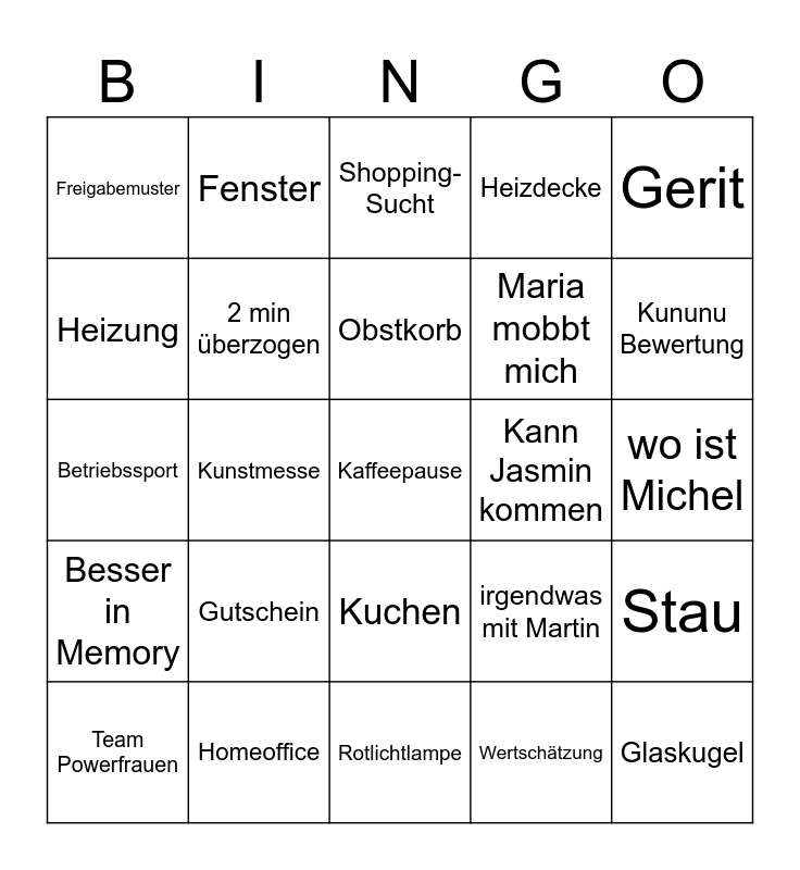 This bingo card has a free space and 24 words: Gutschein, Homeoffice, Obstkorb, Team Powerfrauen, Gerit, Freigabemuster, Heizung, Fenster, Kann Jasmin kommen, Kuchen, Maria mobbt mich, Betriebssport, irgendwas mit Martin, Stau, 2 min überzogen, Wertschätzung, wo ist Michel, Shopping-Sucht, Kununu Bewertung, Kunstmesse, Glaskugel, Besser in Memory, Heizdecke and Rotlichtlampe.