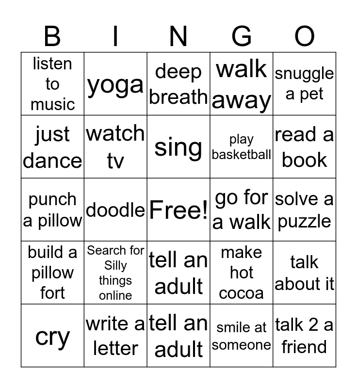 This bingo card has a free space and 24 words: Search for Silly things online, write a letter, sing, cry, snuggle a pet, listen to music, just dance, yoga, go for a walk, tell an adult, play basketball, punch a pillow, make hot cocoa, talk about it, watch tv, smile at someone, solve a puzzle, deep breath, read a book, doodle, talk 2 a friend, build a pillow fort, walk away and tell an adult.