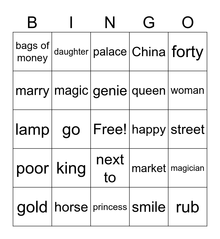 This bingo card has a free space and 27 words: market, tray, queen, princess, marry, palace, daughter, poor, happy, magician, lamp, China, gold, horse, woman, jewels, magic, genie, king, bags of money, street, smile, go, rub, next to, forty and big.