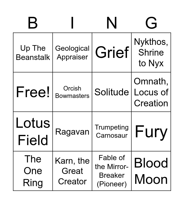 This bingo card has 16 words: Karn, the Great Creator, Fury, Grief, Up The Beanstalk, Lotus Field, Geological Appraiser, Trumpeting Carnosaur, Fable of the Mirror-Breaker (Pioneer), Free!, Orcish Bowmasters, The One Ring, Nykthos, Shrine to Nyx, Ragavan, Omnath, Locus of Creation, Solitude and Blood Moon.