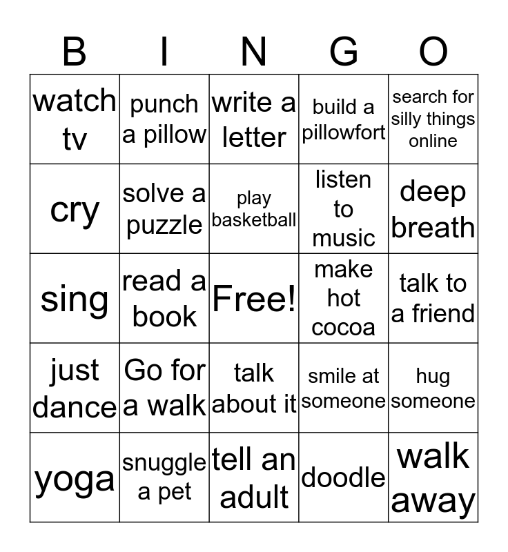 This bingo card has a free space and 24 words: Go for a walk, snuggle a pet, play basketball, yoga, search for silly things online, watch tv, cry, punch a pillow, make hot cocoa, talk about it, listen to music, sing, smile at someone, hug someone, solve a puzzle, doodle, talk to a friend, write a letter, deep breath, read a book, walk away, just dance, build a pillowfort and tell an adult.