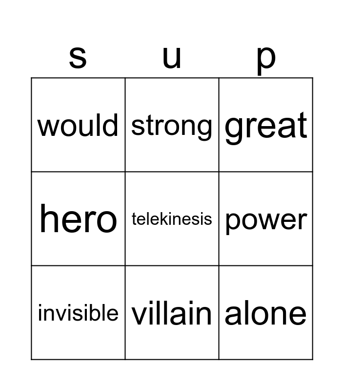 This bingo card has a free space and 8 words: power, great, strong, invisible, would, alone, hero and villain.
