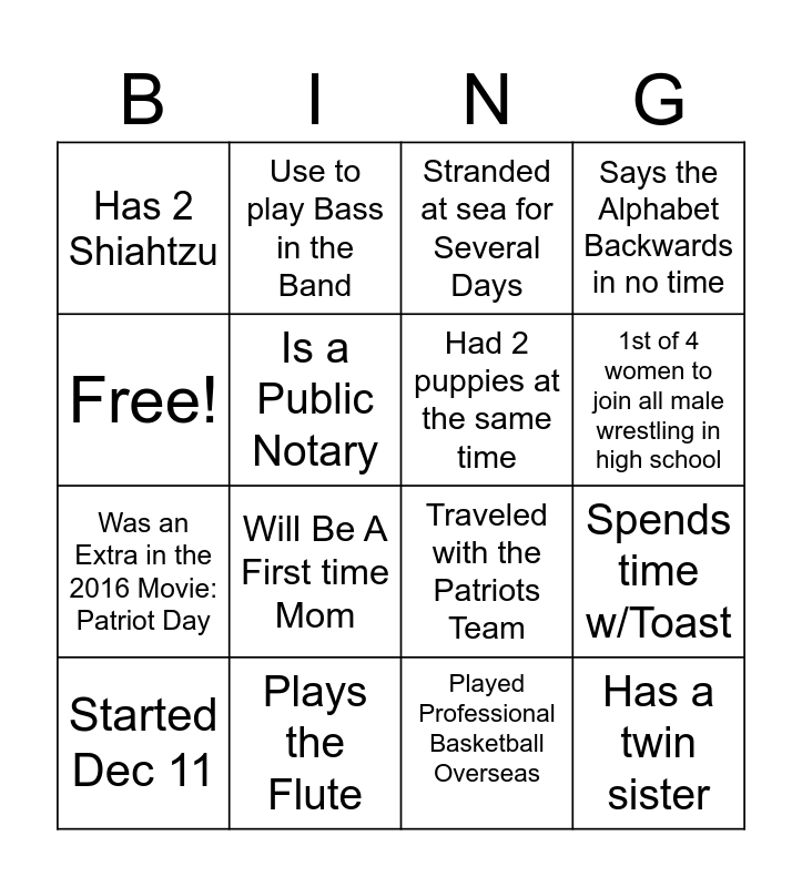 This bingo card has 16 words: Plays the Flute, Spends time w/Toast, Stranded at sea for Several Days, Has 2 Shiahtzu, Was an Extra in the 2016 Movie: Patriot Day, Use to play Bass in the Band, Traveled with the Patriots Team, Played Professional Basketball Overseas, Free!, Is a Public Notary, Started Dec 11, Says the Alphabet Backwards in no time, Will Be A First time Mom, 1st of 4 women to join all male wrestling in high school, Had 2 puppies at the same time and Has a twin sister.