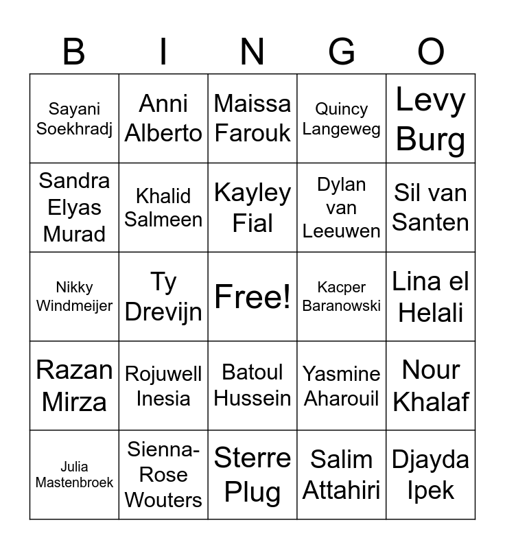 This bingo card has a free space and 72 words: Hoda Abo Hassan, Anni Alberto, Ty Drevijn, Cloë Gelen, Esmee van Hoffen, Loïs Keizer, Quincy Langeweg, Nikita Leegstraten, Dylan van Leeuwen, Neishana Mahmood, Julia Mastenbroek, Mukot Melash Mebrahtom, Sil van Santen, Sayani Soekhradj, Roef van Vliet, Nikky Windmeijer, Yasmine Aharouil, Levy Burg, Aleyna Cifci, Lina el Helali, Rojuwell Inesia, Djayda Ipek, Nour Khalaf, Jeanet Minani, Mohamed Moussaten, Efe Öztürk, Bibi Plug, Inaaya Soebratie, Ellinor Tuzer, Angelina Waldschmit, Sienna-Rose Wouters, Nassim Zlailouh, Yasmin Akhonzada, Achmed Arabo, Salim Attahiri, Jorin Baker, Gillyano de Bruin, Sarah Douayar, Sandra Elyas Murad, Joryel Gieskes, Batoul Hussein, Üveyis Kizilalan, Azra Kurnaz, Caithy Lionar, Sofie Makkus, Razan Mirza, Ayman Ouahia, Efe Özer, Narin Rustam, Fyori Tesfamariam Ftwi, Amira Yasin Salad, Nisa Akyol, Rayna Amirkhan, Kacper Baranowski, Amara van Beveren, Leyka den Dulk, Maissa Farouk, Kayley Fial, Dzemila Graca, Kaitlyn Kalden, Quincy Kipp, Rinaichely Kwidama, Josine Monna, Sterre Plug, Marit Reijgers, Penas Saba, Khalid Salmeen, Maricia Sanches, Thaisheney Suares, Mimi Thode, Zoë Verhoeven and Raghad Yahya.
