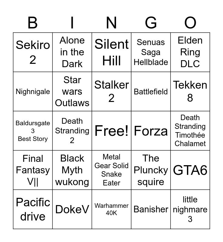 This bingo card has a free space and 24 words: Black Myth wukong, DokeV, Stalker 2, Pacific drive, Elden Ring DLC, Sekiro 2, Nighnigale, Alone in the Dark, Forza, Metal Gear Solid Snake Eater, Battlefield, Baldursgate 3 Best Story, The Pluncky squire, GTA6, Star wars Outlaws, Banisher, Death Stranding Timothée Chalamet, Silent Hill, Tekken 8, Death Stranding 2, little nighmare 3, Final Fantasy V||, Senuas Saga Hellblade and Warhammer 40K.