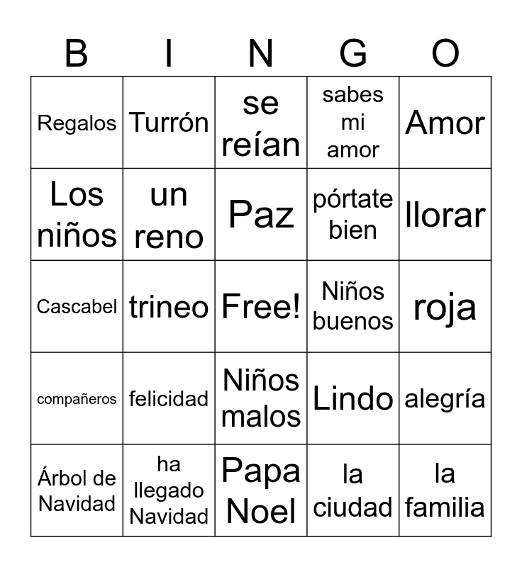 This bingo card has a free space and 25 words: felicidad, Papa Noel, Paz, Árbol de Navidad, Amor, Regalos, Los niños, Turrón, Niños buenos, Niños malos, pórtate bien, Cascabel, Lindo, alegría, un reno, la nariz, roja, se reían, llorar, trineo, la familia, ha llegado Navidad, compañeros, sabes mi amor and la ciudad.