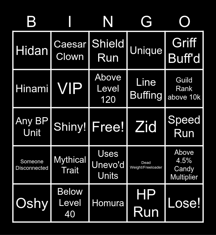 This bingo card has a free space and 24 words: Mythical Trait, Below Level 40, Above Level 120, Oshy, Griff Buff'd, Hidan, Hinami, Caesar Clown, Zid, Uses Unevo'd Units, Line Buffing, Any BP Unit, Dead Weight/Freeloader, Above 4.5% Candy Multiplier, VIP, HP Run, Speed Run, Shield Run, Guild Rank above 10k, Shiny!, Lose!, Someone Disconnected, Unique and Homura.