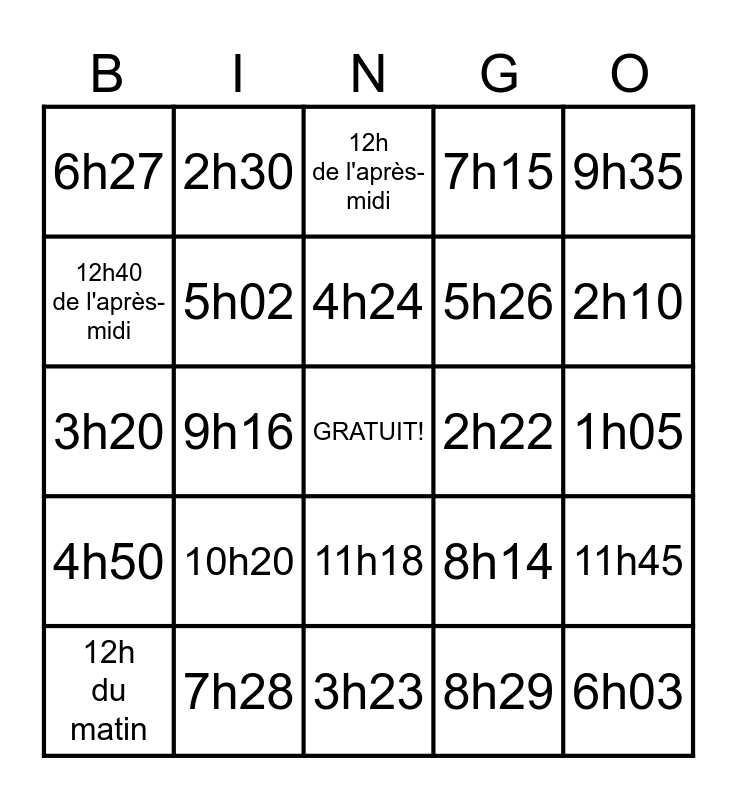 This bingo card has a free space and 29 words: 12h du matin, 1h25, 9h16, 1h21, 6h27, 12h de l'après-midi, 5h02, 10h20, 2h22, 7h28, 1h05, 6h03, 3h23, 8h29, 2h10, 7h48, 11h18, 4h50, 9h35, 3h20, 8h14, 12h19 du matin, 5h26, 12h40 de l'après-midi, 7h15, 2h30, 11h45, 4h24 and 4h25.