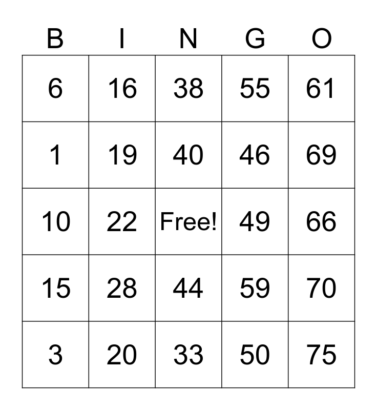 This bingo card has a free space and 24 words: 3, 28, 40, 50, 61, 6, 16, 38, 49, 66, 10, 19, 59, 70, 1, 20, 33, 55, 69, 15, 22, 44, 46 and 75.