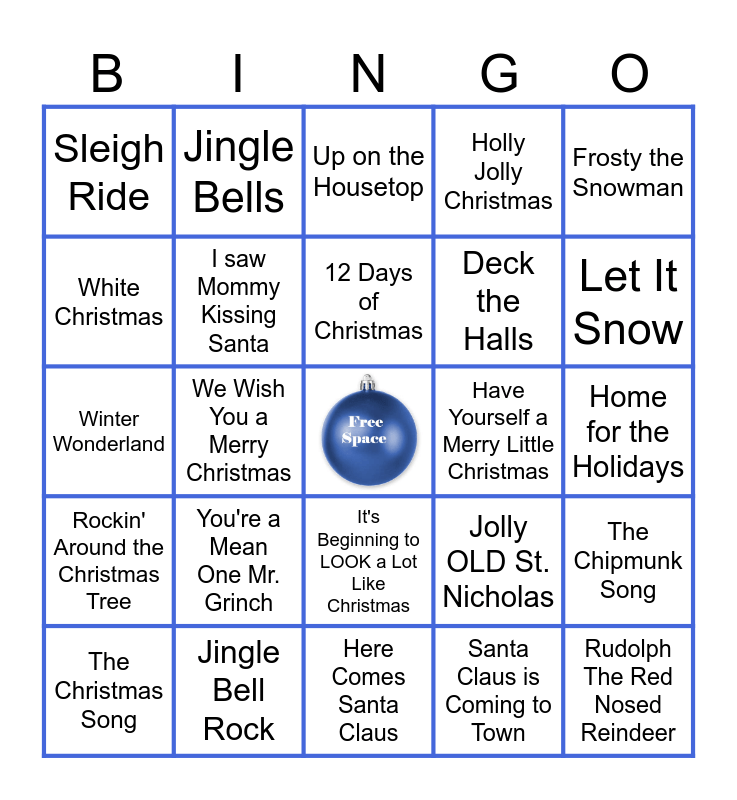 This bingo card has a free space and 24 words: You're a Mean One Mr. Grinch, Jingle Bell Rock, 12 Days of Christmas, The Christmas Song, Frosty the Snowman, Sleigh Ride, White Christmas, Jingle Bells, Have Yourself a Merry Little Christmas, It's Beginning to LOOK a Lot Like Christmas, Deck the Halls, Winter Wonderland, Jolly OLD St. Nicholas, The Chipmunk Song, I saw Mommy Kissing Santa, Santa Claus is Coming to Town, Home for the Holidays, Up on the Housetop, Let It Snow, We Wish You a Merry Christmas, Rudolph The Red Nosed Reindeer, Rockin' Around the Christmas Tree, Holly Jolly Christmas and Here Comes Santa Claus.