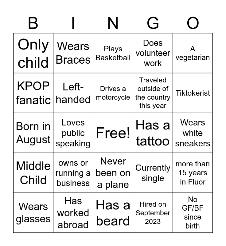 This bingo card has a free space and 61 words: Plays a musical instrument, Has worked abroad, Has pets, Has a tattoo, Knows how to cook, More than 5 years in fluor, Left-handed, Plays a video game, Does volunteer work, Prefers tea over coffee, KPOP fanatic, Lives in Batangas, Drives a motorcycle, Coffee lover, Speaks 3 languages, Only child, Loves public speaking, Plays Basketball, Loves spicy food, Tiktokerist, Born in August, Wears Braces, Has a great singing voice, Currently single, Born in December, is a Sweet tooth, Has tried Sky diving, Afraid of heights, Traveled outside of the country this year, A good dancer, Plays badminton, Received a spotlight award this year, Didn't sleep last night, Is the oldest child, A vegetarian, Wears glasses, Wears gold necklace, Has a beard, Has a curly hair, Wears white sneakers, Wears Heels, owns or running a business, Never been on a plane, Allergic to seafod, No GF/BF since birth, Received a service milestone award this year, has always been the JOKER of the group, Zumba Enthusiast, ELG Member, more than 15 years in Fluor, Middle Child, Hired on October 2023, EAT Member, Hired on September 2023, PDDM Senior Specialist, Plant Lovers, GAP member, born in January, More than 5 years in Fluor, Experienced Foreign Assignment and Loves to watch KDrama.
