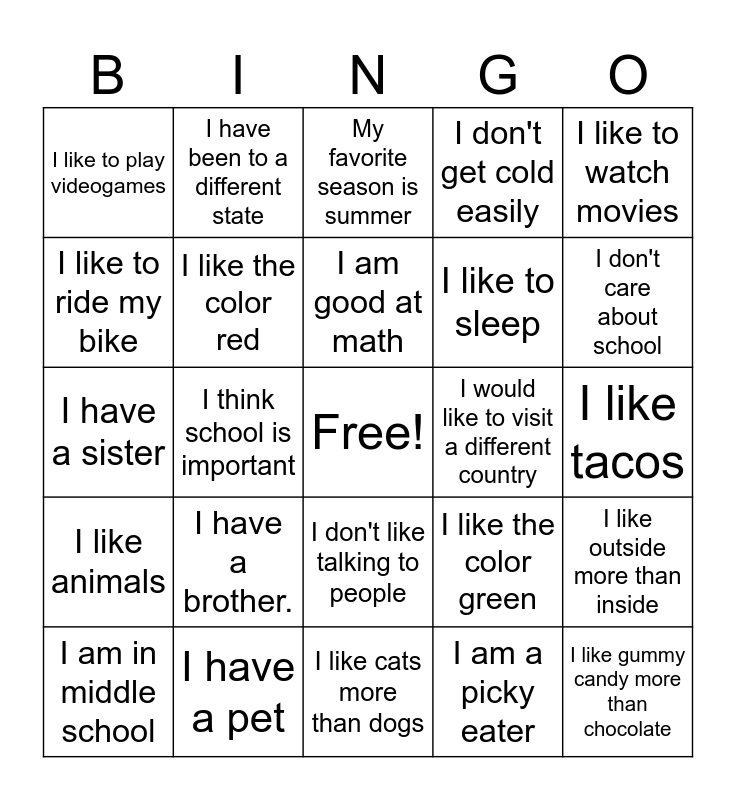 This bingo card has a free space and 24 words: I have a brother., I have a pet, I am good at math, I am in middle school, I like to watch movies, I like to play videogames, I like to ride my bike, I have been to a different state, I would like to visit a different country, I don't like talking to people, I like to sleep, I have a sister, I like the color green, I like outside more than inside, I like the color red, I am a picky eater, I like tacos, My favorite season is summer, I don't care about school, I think school is important, I like gummy candy more than chocolate, I like animals, I don't get cold easily and I like cats more than dogs.