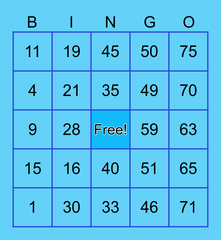 This bingo card has a free space and 24 words: 1, 16, 35, 46, 75, 11, 19, 45, 59, 63, 9, 21, 51, 65, 4, 30, 33, 50, 70, 15, 28, 40, 49 and 71.