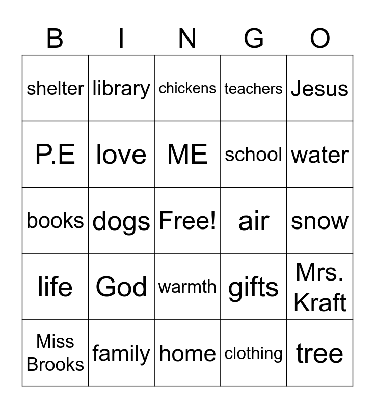 This bingo card has a free space and 30 words: family, cats, dogs, friends, shelter, chickens, love, warmth, air, home, snow, tree, clothing, shoes, water, holidays, gifts, life, God, Jesus, books, food, library, school, P.E, teachers, Mrs. Kraft, Miss Brooks, ME and games.