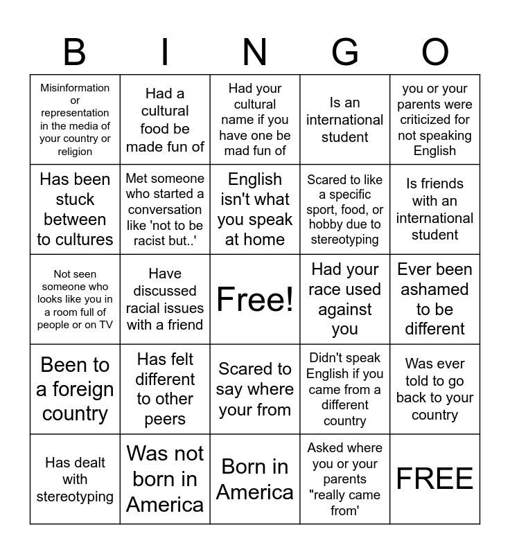 This bingo card has a free space and 24 words: Has dealt with stereotyping, Has felt different to other peers, English isn't what you speak at home, Asked where you or your parents "really came from', you or your parents were criticized for not speaking English, Misinformation or representation in the media of your country or religion, Had a cultural food be made fun of, Had your cultural name if you have one be mad fun of, Had your race used against you, Ever been ashamed to be different, Not seen someone who looks like you in a room full of people or on TV, Met someone who started a conversation like 'not to be racist but..', Didn't speak English if you came from a different country, Was ever told to go back to your country, Has been stuck between to cultures, Was not born in America, Born in America, Is an international student, Is friends with an international student, Been to a foreign country, Have discussed racial issues with a friend, Scared to say where your from, Scared to like a specific sport, food, or hobby due to stereotyping and FREE.