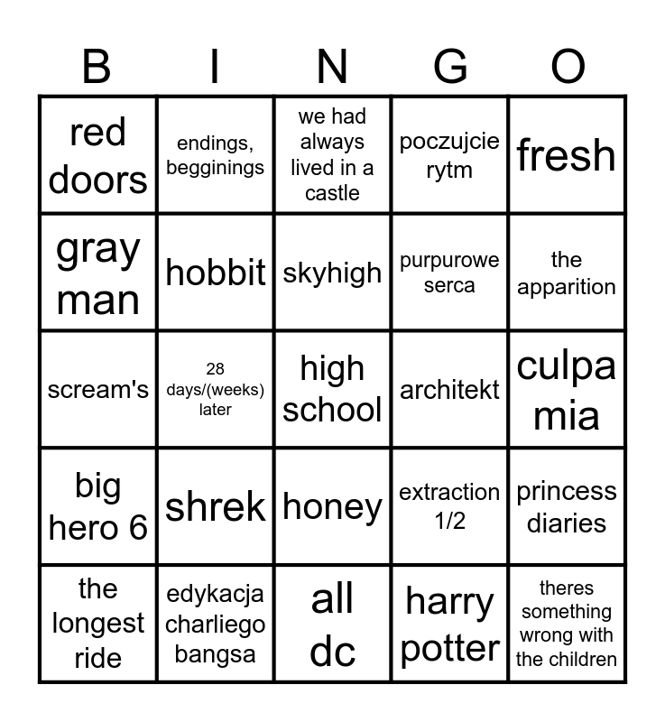 This bingo card has 25 words: shrek, all dc, skyhigh, the longest ride, fresh, red doors, gray man, endings, begginings, architekt, honey, purpurowe serca, scream's, extraction 1/2, princess diaries, hobbit, theres something wrong with the children, culpa mia, we had always lived in a castle, the apparition, 28 days/(weeks) later, high school, edykacja charliego bangsa, big hero 6, poczujcie rytm and harry potter.