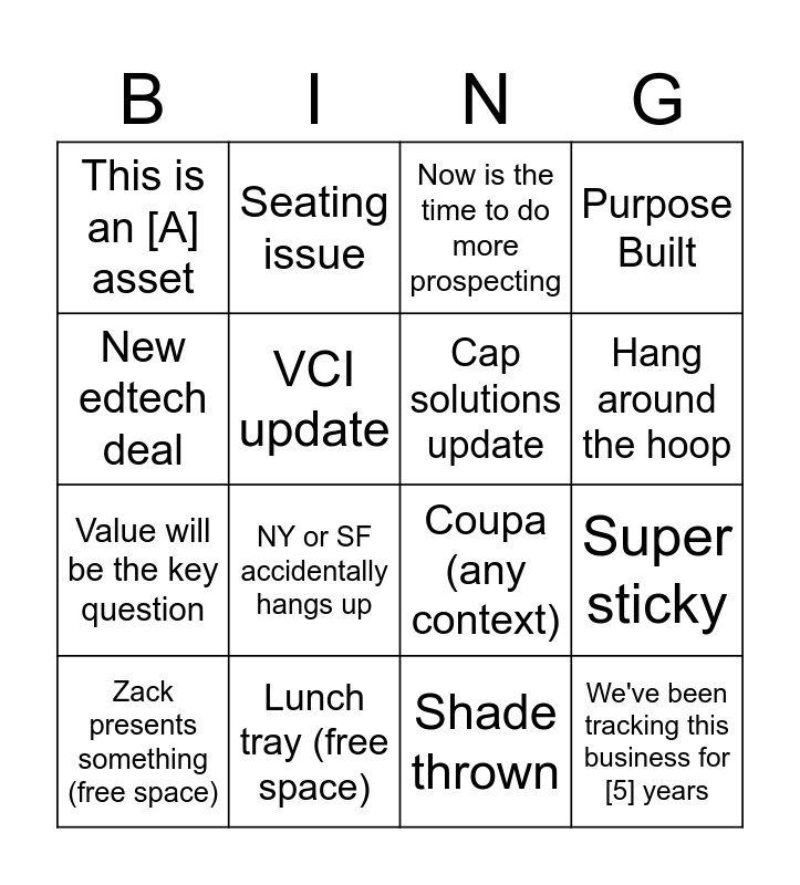 This bingo card has 16 words: Lunch tray (free space), Super sticky, Now is the time to do more prospecting, This is an [A] asset, Value will be the key question, Seating issue, Coupa (any context), Shade thrown, New edtech deal, VCI update, Zack presents something (free space), Purpose Built, NY or SF accidentally hangs up, Hang around the hoop, Cap solutions update and We've been tracking this business for [5] years.