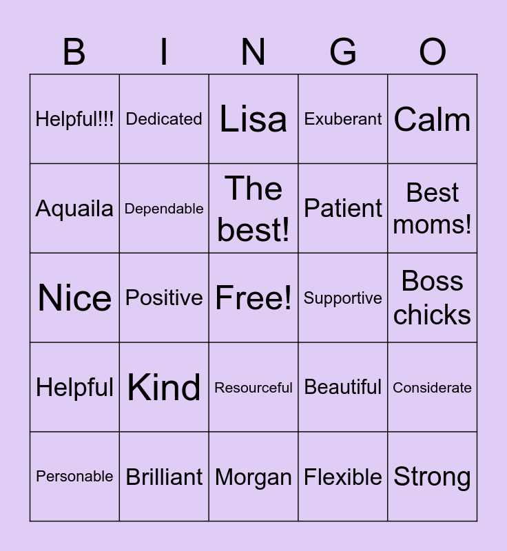 This bingo card has a free space and 27 words: Beautiful, Quick, Patient, Morgan, Aquaila, Lisa, Dedicated, Helpful, Supportive, Considerate, Nice, Exuberant, Personable, Brilliant, Best moms!, Collaborative, Dependable, The best!, Kind, Helpful!!!, Boss chicks, Flexible, Positive, Strong, Resourceful, Calm and Confident.