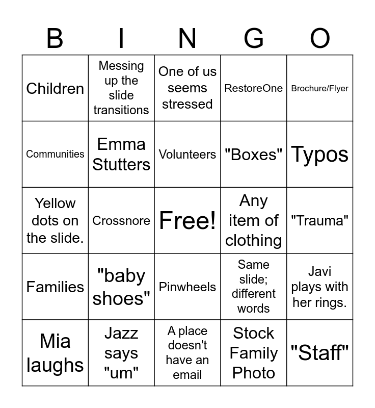 This bingo card has a free space and 24 words: "baby shoes", Jazz says "um", Volunteers, Mia laughs, Brochure/Flyer, Children, Communities, Messing up the slide transitions, Any item of clothing, Pinwheels, "Boxes", Yellow dots on the slide., Same slide; different words, Javi plays with her rings., Emma Stutters, Stock Family Photo, "Trauma", One of us seems stressed, Typos, Crossnore, "Staff", Families, RestoreOne and A place doesn't have an email.