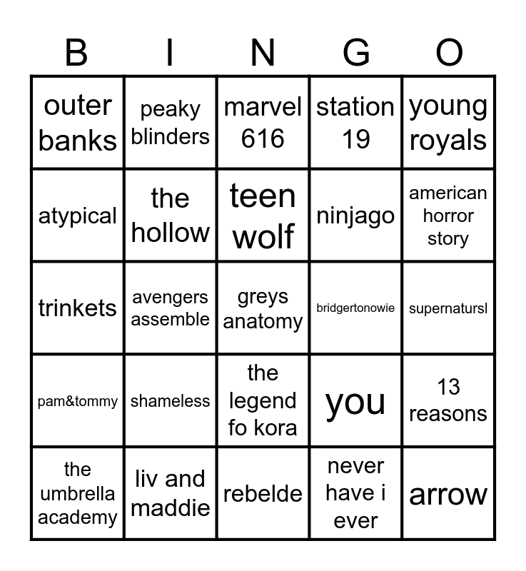 This bingo card has 25 words: shameless, rebelde, teen wolf, the umbrella academy, young royals, outer banks, atypical, peaky blinders, bridgertonowie, the legend fo kora, ninjago, trinkets, you, 13 reasons, the hollow, arrow, supernatursl, marvel 616, american horror story, avengers assemble, greys anatomy, liv and maddie, pam&tommy, station 19 and never have i ever.