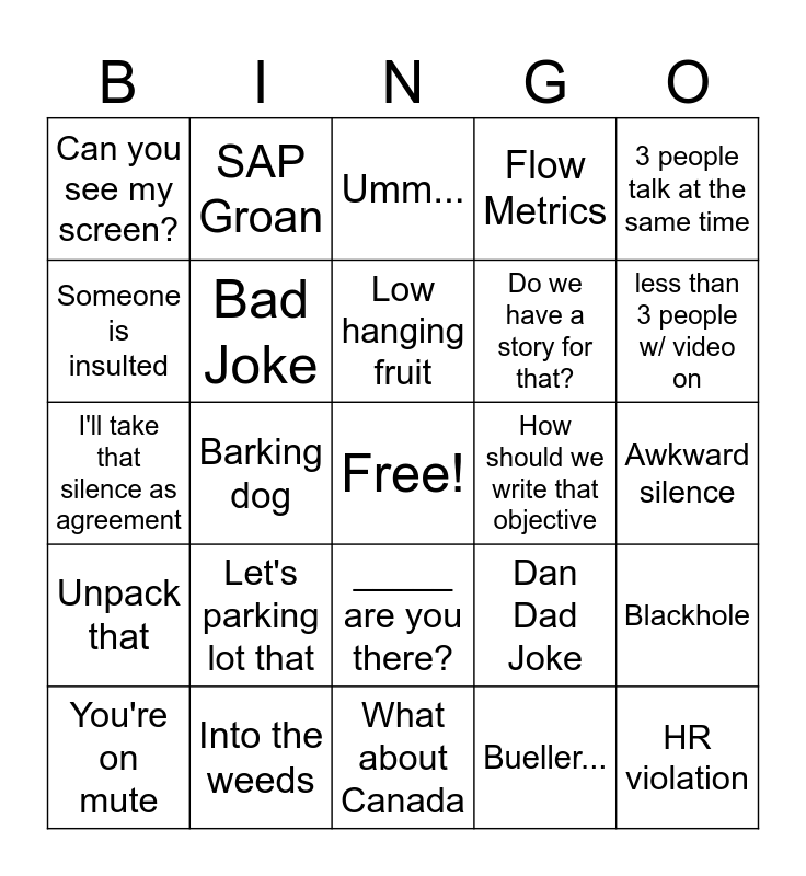 This bingo card has a free space and 29 words: You're on mute, Do you think we can do that?, Barking dog, Ruthless Prioritization, Can you see my screen?, Umm..., Bad Joke, Let's parking lot that, How should we write that objective, Into the weeds, Awkward silence, HR violation, What about Canada, Bueller..., less than 3 people w/ video on, Can I share my screen?, _____ are you there?, Unpack that, 3 people talk at the same time, I'll take that silence as agreement, Dan Dad Joke, Sorry I was doing something else, Do we have a story for that?, Someone is insulted, Flow Metrics, SAP Groan, Blackhole, Low hanging fruit and Jon drops out.
