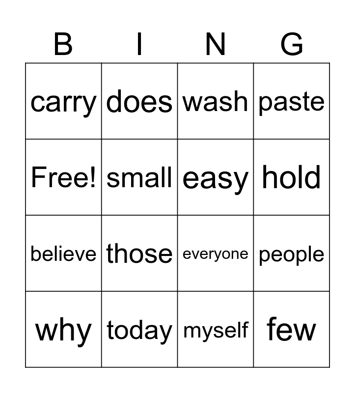This bingo card has 16 words: today, people, wash, carry, believe, does, everyone, myself, Free!, small, why, paste, those, hold, easy and few.