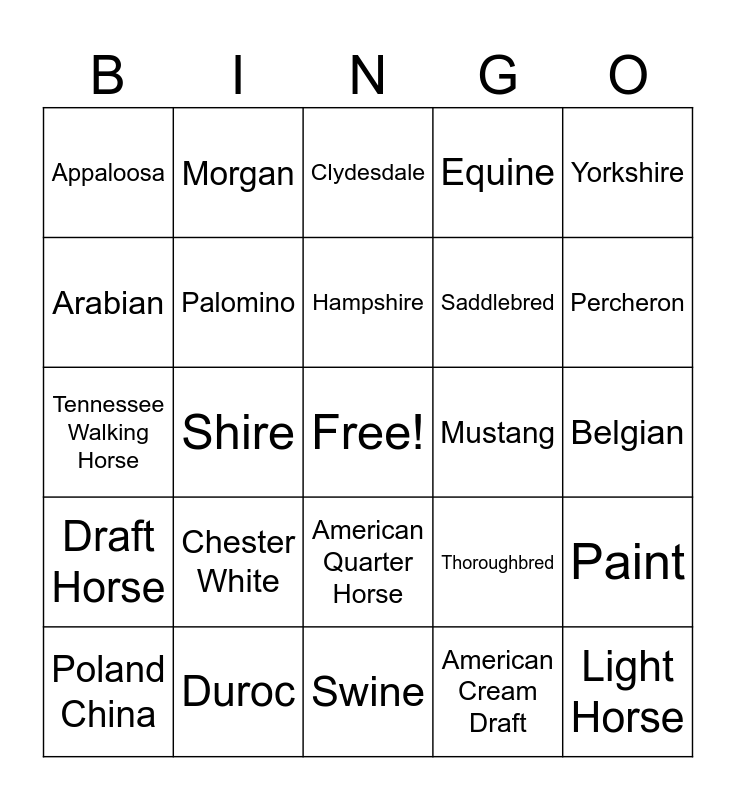 This bingo card has a free space and 24 words: Chester White, Duroc, Hampshire, Poland China, Yorkshire, Appaloosa, Arabian, Morgan, Mustang, American Quarter Horse, Saddlebred, Tennessee Walking Horse, Thoroughbred, Paint, Palomino, American Cream Draft, Belgian, Clydesdale, Percheron, Shire, Light Horse, Draft Horse, Equine and Swine.