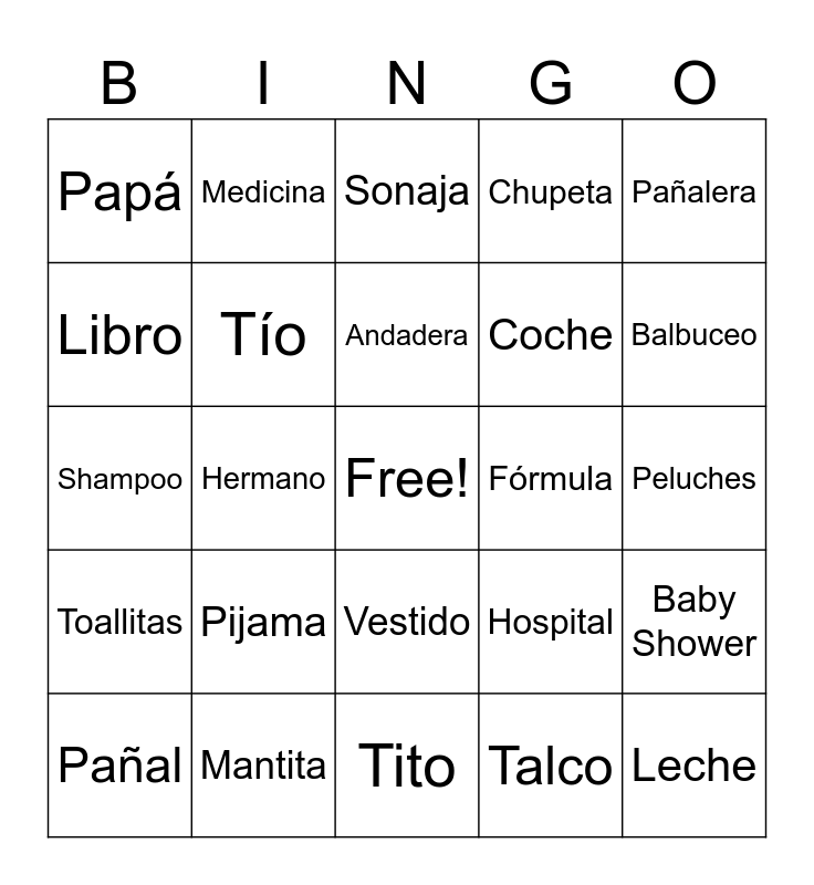 This bingo card has a free space and 55 words: Bebé, Pañal, Mamá, Papá, Tito, Tita, Tío, Tía, Coche, Biberón, Chupeta, Mameluco, Cuna, Mantilla, Babero, Beberito, Pañalera, Hermano, Nieta, Leche, Fórmula, Recién Nacido, Hospital, Sonaja, Corralito, Andadera, Talco, Juguetes, Peluches, Baby Shower, Canguro, Gatear, Medias, Pediatra, Libro, Shampoo, Loción, Toallitas, Mecedora, Mordedor, Medicina, Monitor de Bebé, Bata de Baño, Silla, Pijama, Mantita, Hora del Baño, Dientitos, Termómetro, Balbuceo, Globos, Zapatos, Tina, Vestido and Overall.