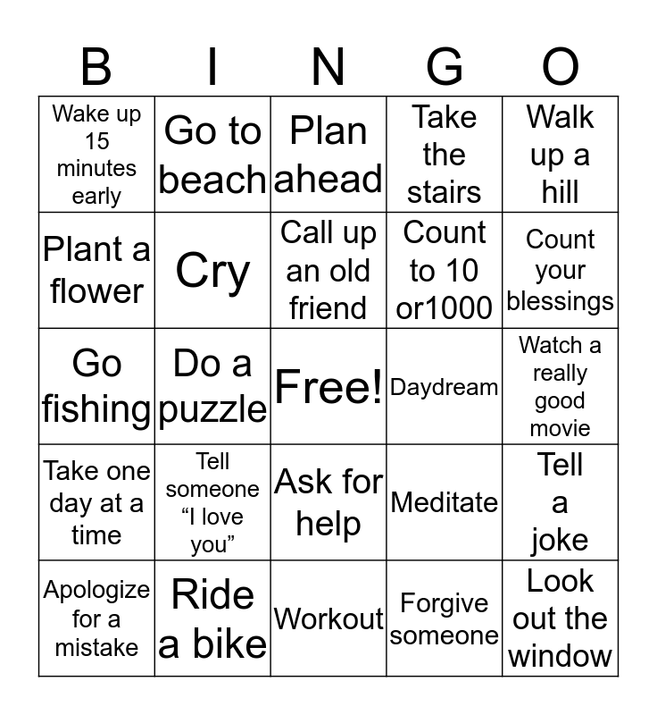 This bingo card has a free space and 24 words: Tell someone “I love you”, Ride a bike, Call up an old friend, Apologize for a mistake, Walk up a hill, Wake up 15 minutes early, Plant a flower, Go to beach, Daydream, Ask for help, Count to 10 or1000, Go fishing, Meditate, Tell a joke, Cry, Forgive someone, Watch a really good movie, Plan ahead, Count your blessings, Do a puzzle, Look out the window, Take one day at a time, Take the stairs and Workout.