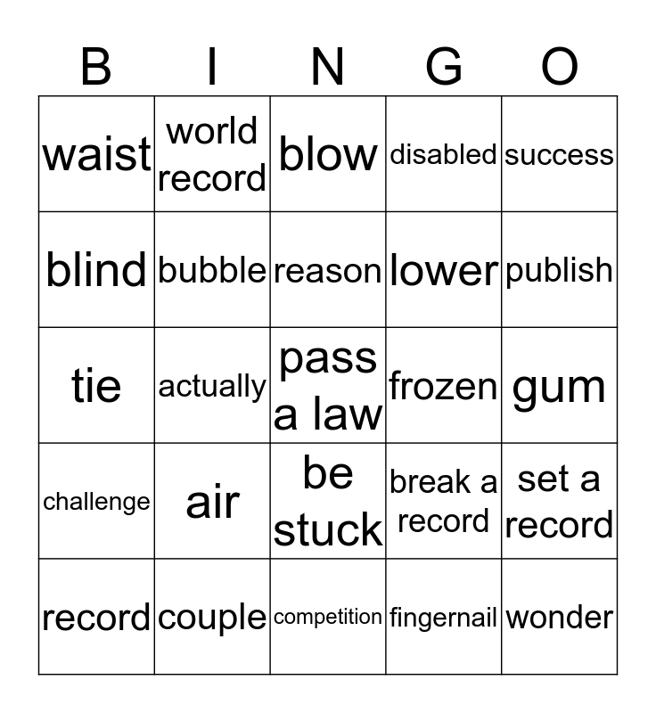 This bingo card has a free space and 24 words: air, couple, reason, record, success, waist, blind, world record, frozen, be stuck, lower, tie, break a record, set a record, bubble, fingernail, gum, blow, publish, actually, wonder, challenge, disabled and competition.