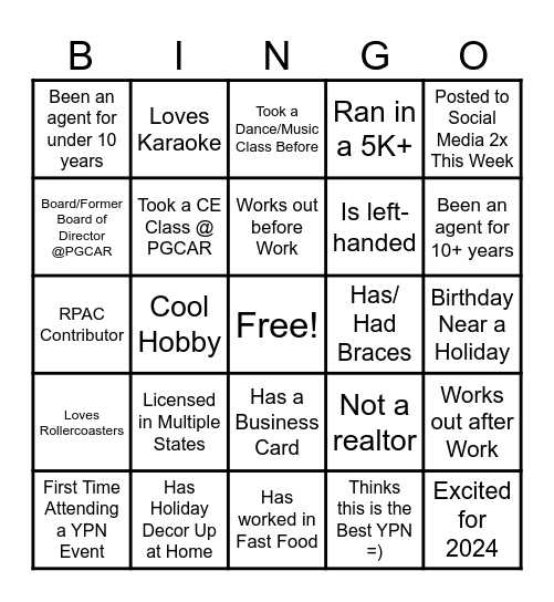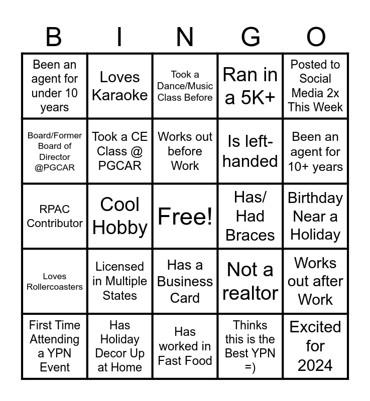 This bingo card has a free space and 29 words: First Time Attending a YPN Event, Can Swim, Cool Hobby, Will send out a client appreciation card, Been an agent for under 10 years, Took a Dance/Music Class Before, Took a CE Class @ PGCAR, Licensed in Multiple States, Has/ Had Braces, Has Holiday Decor Up at Home, Birthday Near a Holiday, Excited for 2024, Has worked in Fast Food, Thinks this is the Best YPN =), Been an agent for 10+ years, Bilingual, Has a Business Card, Loves Rollercoasters, Posted to Social Media 2x This Week, RPAC Contributor, Not a realtor, Traveled out of the Country, Is left-handed, Board/Former Board of Director @PGCAR, Ran in a 5K+, Loves Karaoke, Works out after Work, Works out before Work and Hosted a Seminar Before.