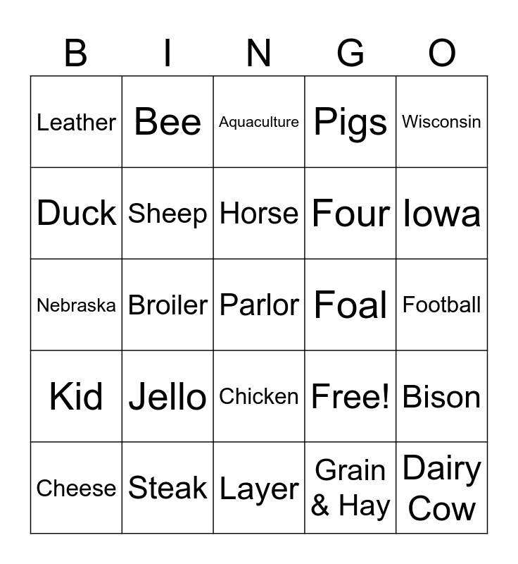 This bingo card has 25 words: Jello, Layer, Horse, Cheese, Wisconsin, Leather, Duck, Bee, Foal, Chicken, Four, Nebraska, Free!, Bison, Sheep, Dairy Cow, Football, Aquaculture, Iowa, Broiler, Parlor, Steak, Kid, Pigs and Grain & Hay.