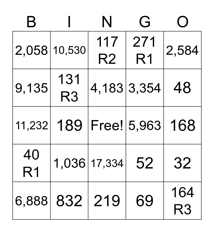 This bingo card has a free space and 24 words: 1,036, 832, 4,183, 6,888, 2,584, 2,058, 9,135, 10,530, 5,963, 17,334, 3,354, 11,232, 52, 32, 131 R3, 69, 168, 117 R2, 48, 189, 164 R3, 40 R1, 271 R1 and 219.