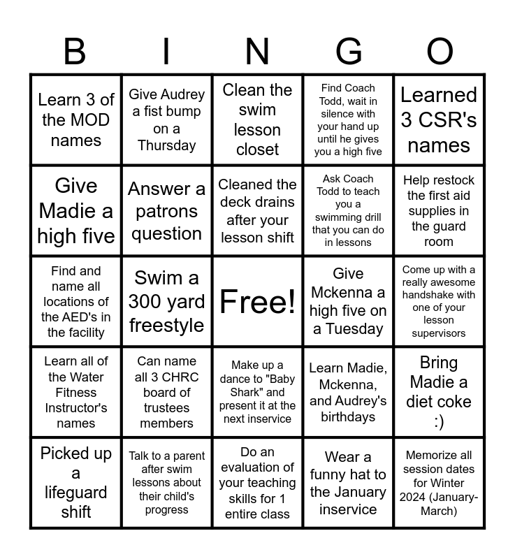 This bingo card has a free space and 24 words: Can name all 3 CHRC board of trustees members, Talk to a parent after swim lessons about their child's progress, Cleaned the deck drains after your lesson shift, Picked up a lifeguard shift, Learned 3 CSR's names, Learn 3 of the MOD names, Give Madie a high five, Give Audrey a fist bump on a Thursday, Give Mckenna a high five on a Tuesday, Make up a dance to "Baby Shark" and present it at the next inservice, Ask Coach Todd to teach you a swimming drill that you can do in lessons, Find and name all locations of the AED's in the facility, Learn Madie, Mckenna, and Audrey's birthdays, Bring Madie a diet coke :), Answer a patrons question, Wear a funny hat to the January inservice, Come up with a really awesome handshake with one of your lesson supervisors, Clean the swim lesson closet, Help restock the first aid supplies in the guard room, Swim a 300 yard freestyle, Memorize all session dates for Winter 2024 (January-March), Learn all of the Water Fitness Instructor's names, Find Coach Todd, wait in silence with your hand up until he gives you a high five and Do an evaluation of your teaching skills for 1 entire class.
