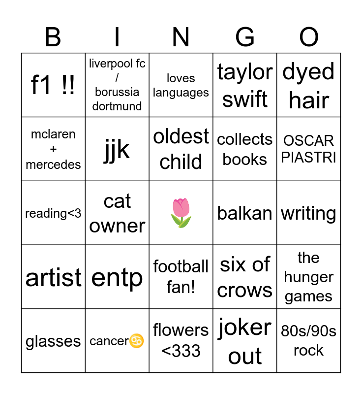 This bingo card has a free space and 24 words: entp, cancer♋, oldest child, glasses, dyed hair, f1 !!, mclaren + mercedes, liverpool fc / borussia dortmund, balkan, football fan!, collects books, reading<3, six of crows, the hunger games, jjk, joker out, writing, loves languages, OSCAR PIASTRI, cat owner, 80s/90s rock, artist, taylor swift and flowers <333.