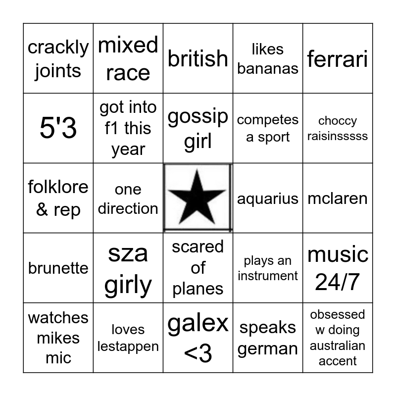 This bingo card has a free space and 24 words: sza girly, loves lestappen, gossip girl, watches mikes mic, ferrari, crackly joints, 5'3, mixed race, aquarius, scared of planes, competes a sport, folklore & rep, plays an instrument, music 24/7, got into f1 this year, speaks german, mclaren, british, choccy raisinsssss, one direction, obsessed w doing australian accent, brunette, likes bananas and galex <3.