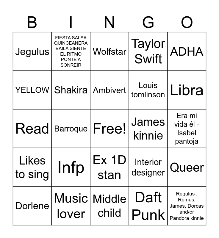 This bingo card has a free space and 24 words: Infp, Music lover, Ambivert, Dorlene, ADHA, Jegulus, YELLOW, FIESTA SALSA QUINCEAÑERA BAILA SIENTE EL RITMO PONTE A SONREIR, James kinnie, Ex 1D stan, Louis tomlinson, Read, Interior designer, Queer, Shakira, Daft Punk, Era mi vida él - Isabel pantoja, Wolfstar, Libra, Barroque, Regulus , Remus, James, Dorcas and/or Pandora kinnie, Likes to sing, Taylor Swift and Middle child.