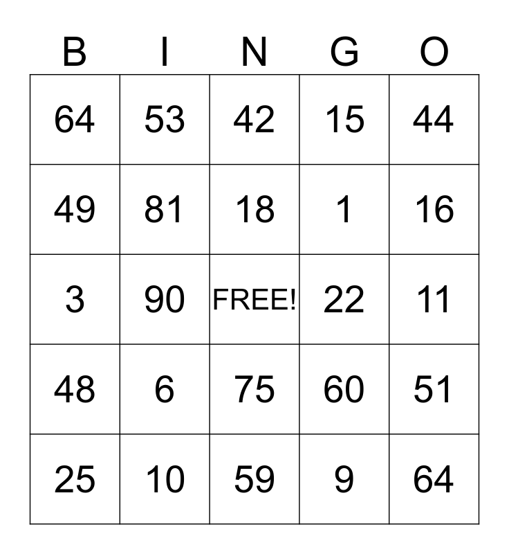 This bingo card has a free space and 24 words: 6, 10, 18, 25, 44, 64, 49, 53, 22, 75, 1, 3, 60, 51, 81, 9, 11, 42, 16, 90, 64, 48, 15 and 59.
