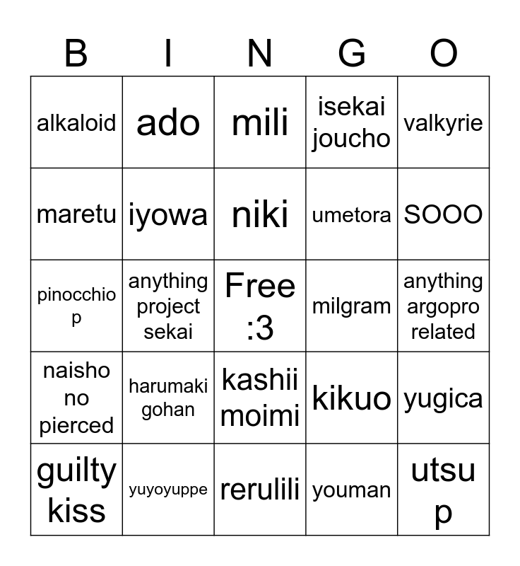 This bingo card has a free space and 24 words: harumaki gohan, yuyoyuppe, niki, guilty kiss, valkyrie, alkaloid, maretu, ado, milgram, kashii moimi, umetora, pinocchio p, kikuo, yugica, iyowa, youman, anything argopro related, mili, SOOO, anything project sekai, utsu p, naisho no pierced, isekai joucho and rerulili.