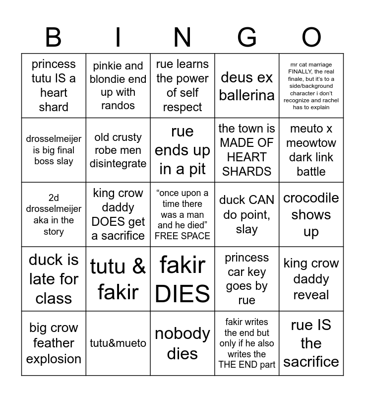 This bingo card has a free space and 24 words: tutu & fakir, tutu&mueto, rue ends up in a pit, big crow feather explosion, mr cat marriage FINALLY, the real finale, but it’s to a side/background character i don’t recognize and rachel has to explain, princess tutu IS a heart shard, drosselmeijer is big final boss slay, pinkie and blondie end up with randos, duck CAN do point, slay, fakir DIES, the town is MADE OF HEART SHARDS, 2d drosselmeijer aka in the story, princess car key goes by rue, king crow daddy reveal, old crusty robe men disintegrate, fakir writes the end but only if he also writes the THE END part, crocodile shows up, rue learns the power of self respect, meuto x meowtow dark link battle, king crow daddy DOES get a sacrifice, rue IS the sacrifice, duck is late for class, deus ex ballerina and nobody dies.