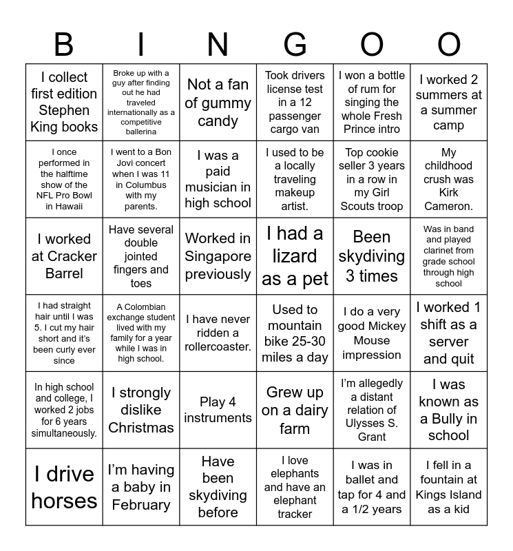 This bingo card has 36 words: Grew up on a dairy farm, Play 4 instruments, I love elephants and have an elephant tracker, I once performed in the halftime show of the NFL Pro Bowl in Hawaii, I had straight hair until I was 5. I cut my hair short and it’s been curly ever since, I had a lizard as a pet, I went to a Bon Jovi concert when I was 11 in Columbus with my parents., Have been skydiving before, I won a bottle of rum for singing the whole Fresh Prince intro, I’m allegedly a distant relation of Ulysses S. Grant, My childhood crush was Kirk Cameron., Took drivers license test in a 12 passenger cargo van, I was known as a Bully in school, Have several double jointed fingers and toes, I used to be a locally traveling makeup artist., I collect first edition Stephen King books, In high school and college, I worked 2 jobs for 6 years simultaneously., Been skydiving 3 times, I worked at Cracker Barrel, Not a fan of gummy candy, Worked in Singapore previously, A Colombian exchange student lived with my family for a year while I was in high school., Used to mountain bike 25-30 miles a day, I have never ridden a rollercoaster., I do a very good Mickey Mouse impression, Broke up with a guy after finding out he had traveled internationally as a competitive ballerina, Top cookie seller 3 years in a row in my Girl Scouts troop, I’m having a baby in February, I was a paid musician in high school, I worked 2 summers at a summer camp, I fell in a fountain at Kings Island as a kid, I drive horses, I worked 1 shift as a server and quit, Was in band and played clarinet from grade school through high school, I strongly dislike Christmas and I was in ballet and tap for 4 and a 1/2 years.