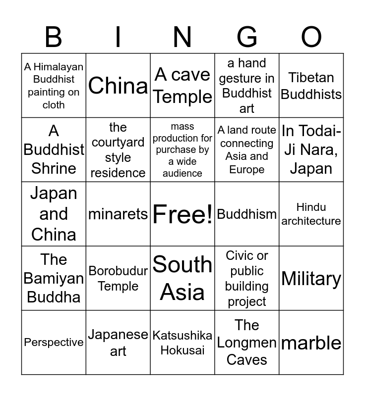 This bingo card has a free space and 25 words: Borobudur Temple, Katsushika Hokusai, mass production for purchase by a wide audience, Perspective, Tibetan Buddhists, A Himalayan Buddhist painting on cloth, A Buddhist Shrine, China, Buddhism, South Asia, A land route connecting Asia and Europe, Japan and China, Civic or public building project, Military, the courtyard style residence, inlaid stone and verses from the Quran, Hindu architecture, A cave Temple, In Todai-Ji Nara, Japan, minarets, marble, Japanese art, The Bamiyan Buddha, a hand gesture in Buddhist art and The Longmen Caves.