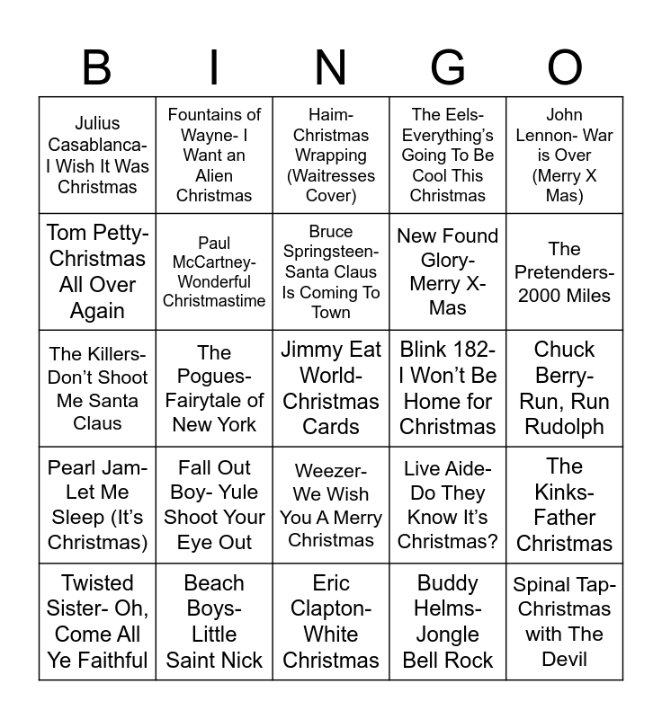 This bingo card has 26 words: Weezer- We Wish You A Merry Christmas, Buddy Helms- Jongle Bell Rock, Bruce Springsteen- Santa Claus Is Coming To Town, Beach Boys- Little Saint Nick, John Lennon- War is Over (Merry X Mas), Julius Casablanca- I Wish It Was Christmas, Tom Petty- Christmas All Over Again, Fountains of Wayne- I Want an Alien Christmas, Chuck Berry- Run, Run Rudolph, Live Aide- Do They Know It’s Christmas?, New Found Glory- Merry X-Mas, The Killers- Don’t Shoot Me Santa Claus, The Kinks- Father Christmas, Twisted Sister- Oh, Come All Ye Faithful, The Pogues- Fairytale of New York, Bob Seger- Sock It To Me, Santa, The Eels- Everything’s Going To Be Cool This Christmas, Pearl Jam- Let Me Sleep (It’s Christmas), Haim- Christmas Wrapping (Waitresses Cover), Jimmy Eat World- Christmas Cards, The Pretenders- 2000 Miles, Eric Clapton- White Christmas, Blink 182- I Won’t Be Home for Christmas, Fall Out Boy- Yule Shoot Your Eye Out, Paul McCartney- Wonderful Christmastime and Spinal Tap- Christmas with The Devil.