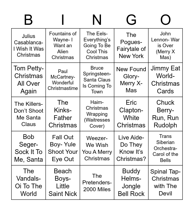 This bingo card has 26 words: Weezer- We Wish You A Merry Christmas, Buddy Helms- Jongle Bell Rock, Bruce Springsteen- Santa Claus Is Coming To Town, Beach Boys- Little Saint Nick, John Lennon- War is Over (Merry X Mas), Julius Casablanca- I Wish It Was Christmas, Tom Petty- Christmas All Over Again, Fountains of Wayne- I Want an Alien Christmas, Chuck Berry- Run, Run Rudolph, Live Aide- Do They Know It’s Christmas?, New Found Glory- Merry X-Mas, The Killers- Don’t Shoot Me Santa Claus, Trans Siberian Orchestra- Carol of the Bells, The Vandals- Oi To The World, The Kinks- Father Christmas, Twisted Sister- Oh, Come All Ye Faithful, The Pogues- Fairytale of New York, Bob Seger- Sock It To Me, Santa, The Eels- Everything’s Going To Be Cool This Christmas, Haim- Christmas Wrapping (Waitresses Cover), Jimmy Eat World- Christmas Cards, The Pretenders- 2000 Miles, Eric Clapton- White Christmas, Fall Out Boy- Yule Shoot Your Eye Out, Paul McCartney- Wonderful Christmastime and Spinal Tap- Christmas with The Devil.